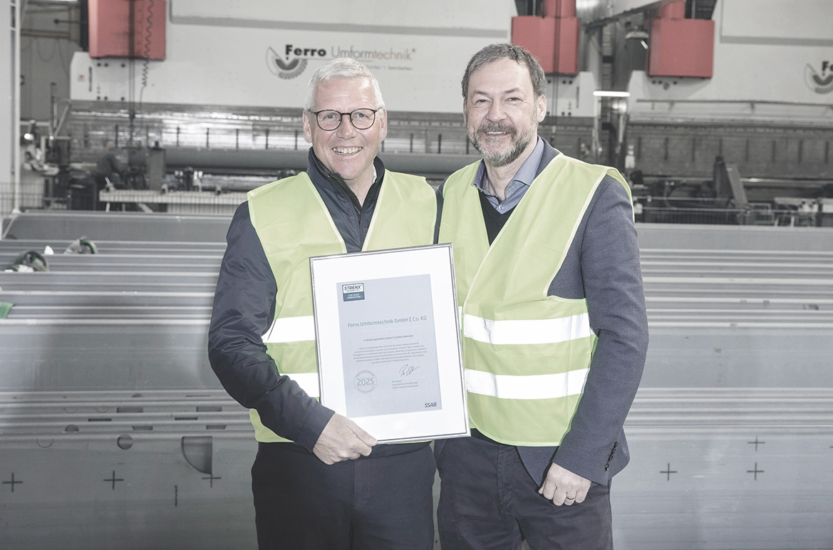 Ein bedeutender Meilenstein für unser Unternehmen: Ferro Umformtechnik wurde im März 2025 als Strenx® Certified Fabricator ausgezeichnet. Diese Zertifizierung wird vom schwedischen Stahlkonzern SSAB vergeben, dem weltweit führenden Hersteller von hochfesten und verschleißfesten Stählen.